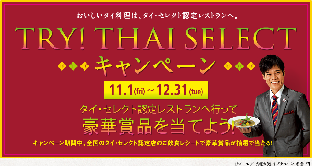 タイ国政府観光庁 11 1 12 31 Try Thai Select キャンペーン開催 タイ 国政府商務省国際貿易振興局 Ditp では 厳しい基準をクリアしたタイレストランを タイ セレクト として認定しています 同局では 日本全国タイ セレクト認定店でのご飲食で豪華
